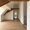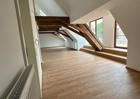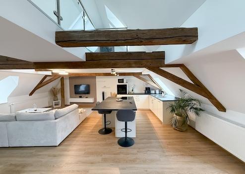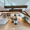 Das Herzstück der Wohnung ist der großzügige Wohnbereich mit sichtbaren Holzbalken, großen Fensterflächen und direktem Zugang zur weitläufigen Dachterrasse. Hier genießen Sie sonnige Stunden und einen herrlichen Blick über die Dächer des Ortes.