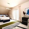 Das Schlafzimmer im Erdgeschoss ist ruhig gelegen und dank großem dreiflügeligem Fenster ebenfalls sehr hell. Das modernisierte Bad ist rollstuhlgerecht konzipiert und verfügt über eine großzügige, ebenerdige Dusche sowie ein Podest mit allen Anschlüssen für Waschmaschine und Trockner. Das separate WC ist mit Hänge-Toilette, Urinal und Handwaschbecken ausgestattet.