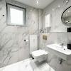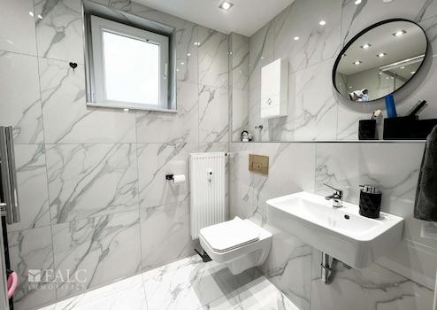 • das moderne Badezimmer präsentiert sich in zeitgemäßem Design,