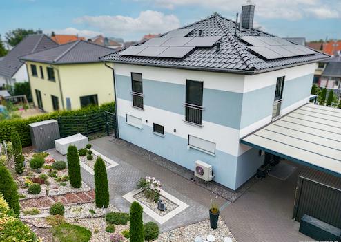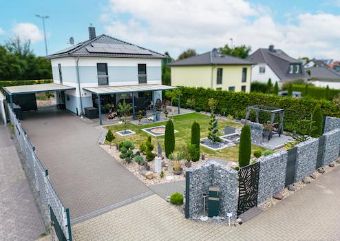 Auch die Außenanlage des Hauses weiß zu begeistern. Der edel bepflanzte Vorgarten mit Zugang zum Haus und zur Terrasse unterstreicht schon beim Ankommen die besondere Ausstrahlung des Hauses. Dazu lädt er zum Verweilen und Entspannen ein und bietet Kindern gleichzeitig ausreichend Raum zum Spielen an der frischen Luft. Für Fahrzeuge steht ein Doppelcarport zur Verfügung, während ein zusätzlicher Schuppen praktischen Stauraum für Gartengeräte oder Fahrräder bereithält. Ein zusätzliches Highlight ist die vorhandene Wallbox, die Ihnen komfortables und zukunftssicheres Laden Ihres Elektrofahrzeugs direkt am Haus ermöglicht. Auf dem Dach befindet sich eine moderne Photovoltaikanlage mit 8,4 kWp Leistung und einem 6 kW Speicher, die für nachhaltige Energieversorgung und geringere Betriebskosten sorgt.
