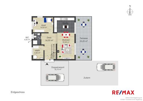 Schon beim Betreten empfängt Sie eine freundliche Diele, die in alle Bereiche des Erdgeschosses führt. Neben einem praktischen Hauswirtschaftsraum mit Waschmaschinenanschluss und einem Gäste-Bad mit ebenerdiger Dusche befindet sich hier auch ein Zimmer, das sich flexibel als Büro oder gemütliches Gästezimmer nutzen lässt. Das Herzstück bildet jedoch der weitläufige Wohn- und Essbereich mit offener Küche und über 50m² Fläche. Dank der großzügigen Fensterfronten entsteht ein lichtdurchflutetes Ambiente, das modernes Wohnen und Geborgenheit verbindet. Von hier aus gelangen Sie direkt auf die 33m² große, überdachte Terrasse - perfekt für laue Sommerabende, gesellige Grillrunden oder entspannte Stunden im Kreis der Familie.