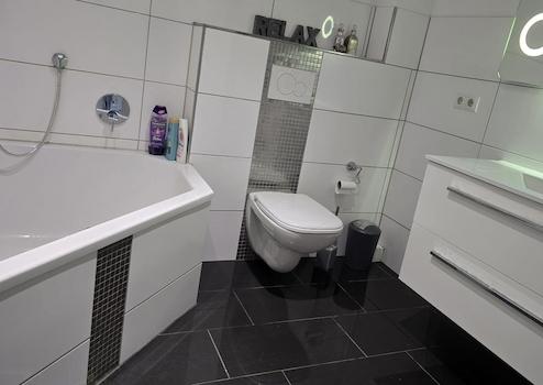 Das Bad im 1.OG wurde 2018 inklusive aller Leitungen erneuert. Hier befindet sich eine grosse Eckbadewanne.