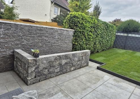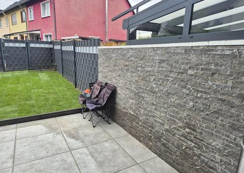 Vorgarten in Vollstein sehr geschmackvoll und hochwertig angelegt. Terrasse mit grossen Platten wurde 2023 saniert. Grenzmauern mit hochwertigen Vollsteinriemchen verziert. Neuer Garten Zaun der Firma Leggi in Anthrazit und Tor nach aussen. Neue Haustüre 2020.