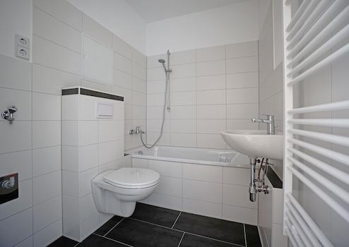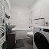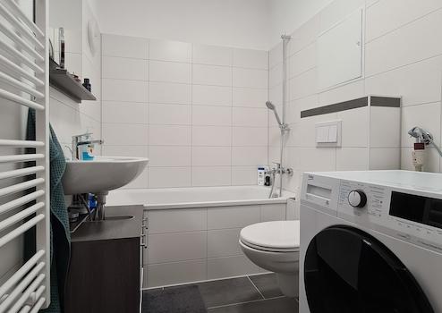 - modern gefliestes Wannenbad mit Waschmaschinenanschluss & praktischem Handtuchheizkörper