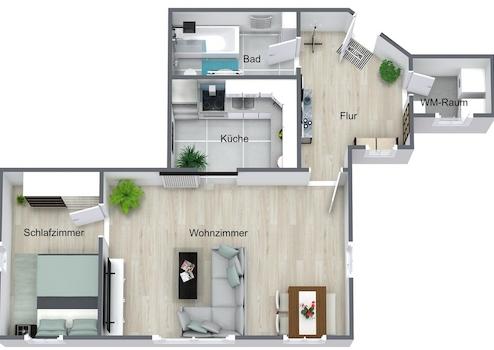 Das lichtdurchflutete Wohnzimmer bietet Raum zum Entspannen, die angrenzende Küche lädt zu kulinarischen Kochmomenten ein. Das Schlafzimmer überzeugt durch einen praktischen Schnitt und schafft einen ruhigen Rückzugsort.