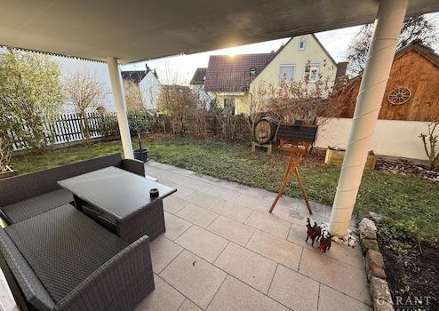 Die Terrasse mit einem Garten der perfekten Größe, nicht zu viel Arbeit
