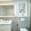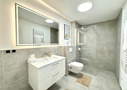 Das Badezimmer präsentiert sich ebenfalls komplett erneuert und auf dem neuesten Stand: Eine bodengleiche Regendusche, hochwertige Sanitärkeramik und moderne Materialien schaffen ein harmonisches, stilvolles Wohlfühlbad. Der nahezu barrierefreie Zugang rundet das komfortable Wohnkonzept ab.