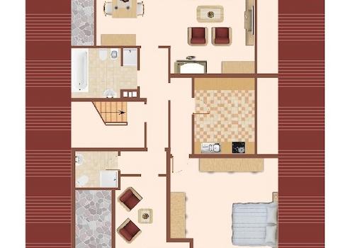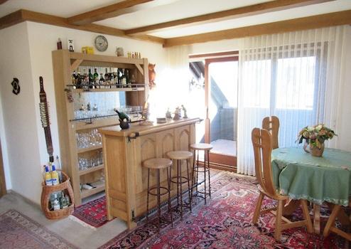 Die Wohnung hat eine gehobene und gepflegte Ausstattung; sie verfügt über zwei Bäder, wobei das Hauptbad über Wanne und Dusche verfügt, das zweite Bad hat eine Dusche. Die Wohnung ist in zwei Wohnbereiche unterteilt, beide Wohnbereiche haben jeweils eine Dachloggia. Im Wohnzimmer befindet sich ein Kamin. Die bauliche Ausstattung entspricht dem Baujahr. Zur Wohnung gehören ferner eine Garage und ein Kellerraum.