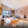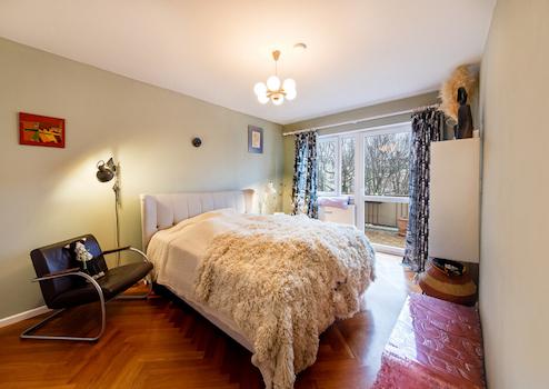 Das lichtdurchflutete Wohnzimmer beeindruckt mit einer Raumhöhe von bis zu 4 Metern sowie einem offenen Marmorkamin, der dem Raum eine elegante und zugleich warme Note verleiht. Der edle Fischgrät-Teakholzparkett (Vollholz) Boden, der sich über Wohnzimmer und Schlafzimmer erstreckt, unterstreicht den exklusiven Charakter der Wohnung.