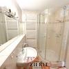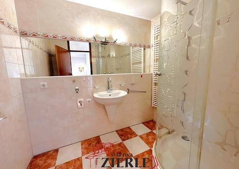 - Badezimmer mit Dusche, Waschbecken, Handtuchheizkörper, Spiegelschrank und Waschmaschinenanschluss