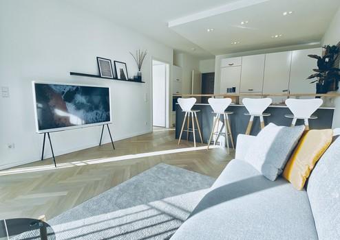 Die offene Wohnküche ist mit einer modernen Design Einbauküche inkl. sämtlicher Elektrogeräte ausgestattet. Durch das abgestimmte Design der Farben mit weißen Fronten und einer zeitlosen Arbeitsplatte fügt sich die Wohnküche harmonisch in Ihren individuellen Wohnstil ein. Die Einbauküche bietet außerordentlich viel Stauraum, welcher u.a. durch einen Vorratsschrank mit Innenauszügen, einen Haushaltsschrank sowie viele Schubladen geschaffen wird. Zudem sorgen die auf Arbeitshöhe eingebaute Geschirrspülmaschine und der Backofen für ein rückenfreundliches Arbeiten. Die Wandnische mit integriertem Hochschrank fügt sich harmonisch in das Gesamtbild ein. Außerdem gewährleistet das Induktionskochfeld mit integriertem Wrasenabzug (Downlüfter) eine komplett freie Sicht in das Wohnzimmer (ohne störende Abzugshaube). Ein besonderes Highlight ist der über der Küche abgehängte Decken-Quader mit integrierter Spot-Beleuchtung. Auf der Rückseite der Küchenzeile entsteht durch die überstehende Arbeitsplatte ein kommunikativer Essplatz, welcher Küche und Wohnzimmer verbindet und das Kochen zum Event macht.