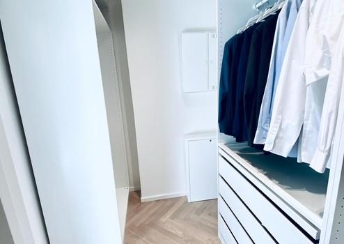 Vom Wohnzimmer aus gelangt man in den Schlafbereich, welcher über ein separates Ankleidezimmer mit reichlich Platz für jede Bedürfnisse verfügt. Durch die smarte Raumaufteilung wird ein exklusiver und ruhiger Schlafbereich geschaffen, der nicht mit Schränken überladen sein muss.