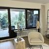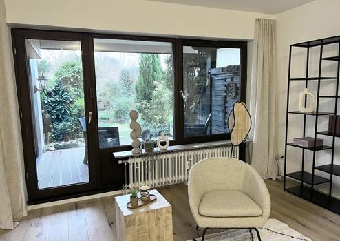 Der großzügige Wohn- und Essbereich öffnet sich zu einer großen Fensterfront mit Blick ins Grüne und bietet Zugang zur überdachten Terrasse und dem angrenzenden Gartenbereich. Der Außenbereich wirkt wie ein privater Rückzugsort – ideal für entspannende Stunden, Frühstück im Freien oder gesellige Abende.