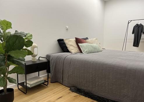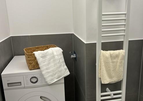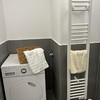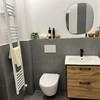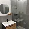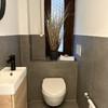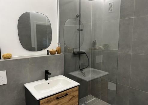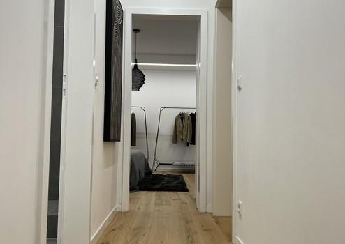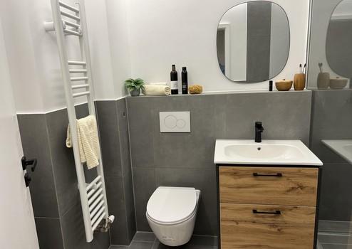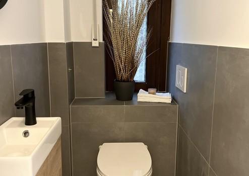 Das Badezimmer wurde komplett neu gestaltet: Walk-in-Dusche mit Glasabtrennung, schwarze Designarmaturen, elegante Fliesen und moderne Beleuchtung sorgen für ein luxuriöses, ruhiges Ambiente. Ein separates Gäste-WC ist ebenfalls vorhanden.