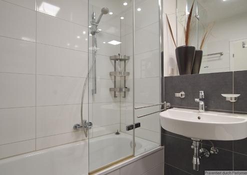 Wohnschlafraum mit Parkettboden, Internetzugang und TV Magenta L sind in der Miete enthalten. Wohnbereich mit Sofa und TV, das Bett ist durch einen Schrank und ein Regal räumlich abgeteilt. Am Fenster gibt es einen Schreibtisch mit Stuhl und direkten Zugan zum Balkon mit Tisch und Stühlen. Die komplett ausgestattete Küche ist sehr modern, mit Kühlschrank und Eisfach, Kochfeld mit Dunstabzug, Backofen, Microwellen-/Dampfgargerät, Toaster, Geschirr usw. Zur Wohnung gehört ein schönes Bad mit Wanne und Duschvorrichtung mit Glastrennwand, Handtuchheizung und großem Spiegel.