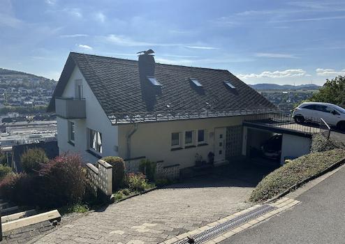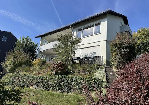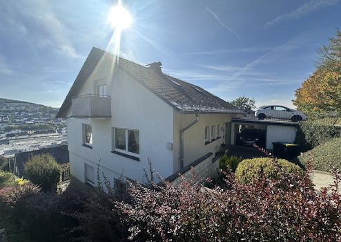 Dank der Hanglage bietet das Haus nicht nur einen reizvollen Ausblick, sondern auch helle, freundliche Räume in beiden Etagen. Eine Garage und ein Stellplatz runden das Angebot ab.