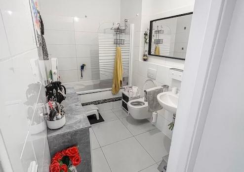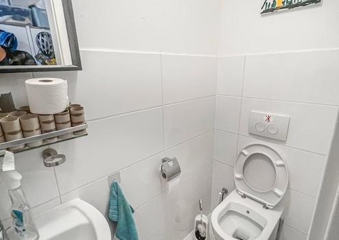 - Badezimmer mit Badewanne und zusätzlichem Gäste-WC