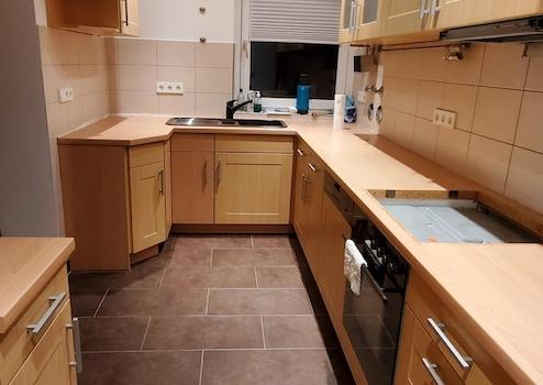 Es wird eine neue Arbeitsplatte, Kochfeld, Backofen, Abzugshaube, Spültisch und Armatur eingebaut (die Bilder der Küche sind nicht aktuell).