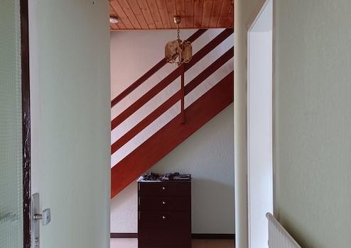 Eine massive Holztreppe führt ins Obergeschoss, wo zwei gemütliche Zimmer warten. Beide Zimmer verfügen über eine breite Fensterfront, die einen schönen Ausblick in Wiesen und Felder ermöglichen.