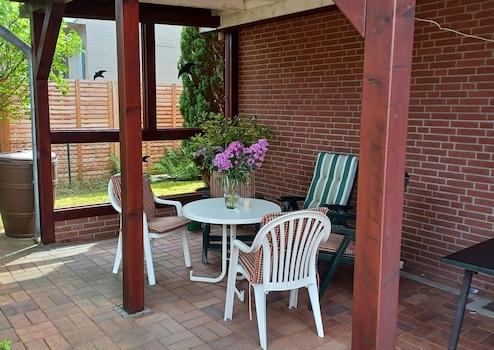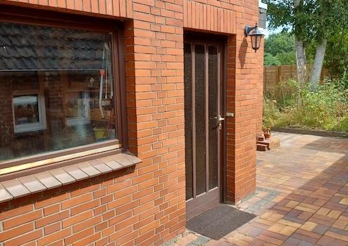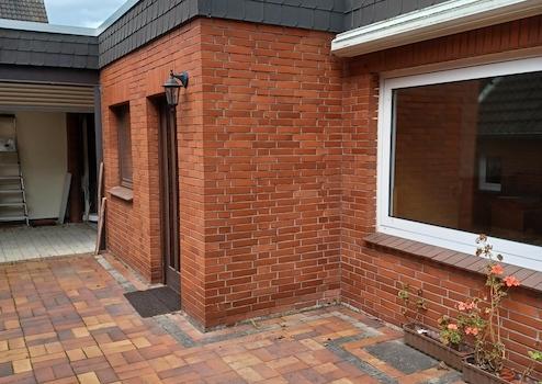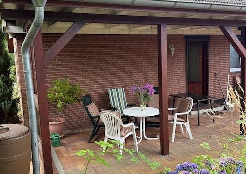 Eine windgeschützte Terrasse (ca. 15 m²) im hinteren Außenbereich des Hauses erweitert den Wohnraum ins Freie und schafft ein stimmungsvolles Ambiente für gesellige Abende und gemütliche Stunden mit Blick in den Garten.