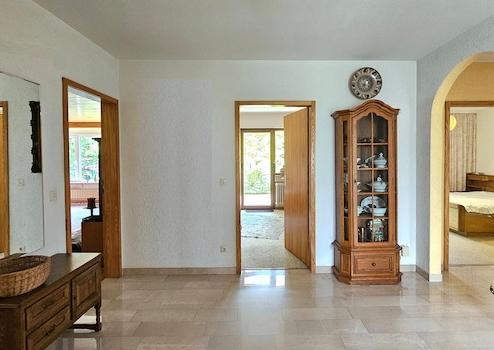 Einige Stufen führen zur Eingangstür. Im Eingangsbereich befindet sich ein Windfang mit Zugang zum Gäste-WC. Geradeaus gelangt man in eine großzügige Diele, von der alle Räumer erreichbar sind.
