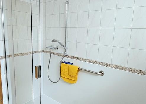 Ebenerdig befinden sich 3 Schlafzimmer und ein Bad mit Fenster und ebenerdiger Dusche.