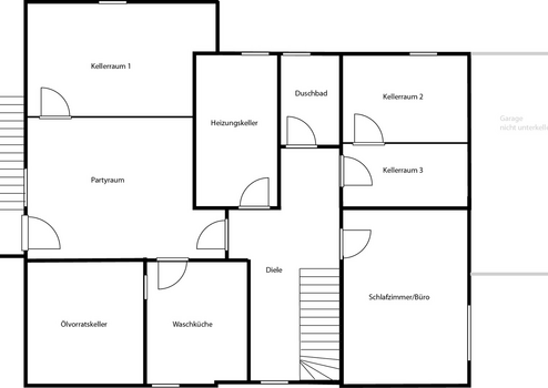 UG: Schlafzimmer/Büro, Partyraum, Diele, Duschbad, 3 Kellerräume, Waschküche, Heizungs- und Ölvorratskeller