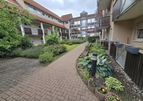 Innenhof, Gemeinschaftsraum mit Einbauküche, Bibliothek, Gästeappartment und das Büro für das Betreute Wohnen befinden sich im Gemeinschaftseigentum. Zu jeder Wohnung gehört ein großes, verschließbares Kellerabteil.