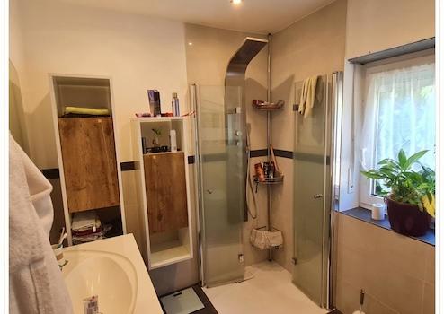 Neues Bad mit begehbarer Dusche; Diele mit schöner alter Holztreppe ins Dachgeschoss.