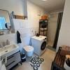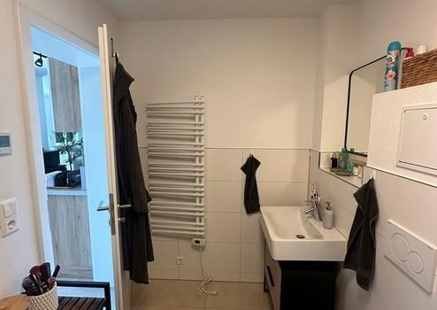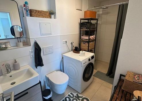 Im Bad befindet sich die Bodenebene Dusche mit Rainshower und Echtglas-Abtrennung. Der Handtuchwärmer und der Waschmaschinenplatz schaffen zusätzlichen Komfort.