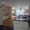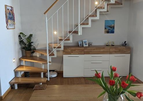 Der einladende, geflieste Eingangsbereich führt Sie in den hellen und offenen Wohn- und Essbereich (ca. 35 m²) mit Parkettboden. Das gesamte Erdgeschoss ist mit einer komfortablen Fußbodenheizung ausgestattet. Von hier aus haben Sie direkten Zugang zur sonnigen West-Terrasse. Dank der platzsparenden Schiebetür kann der Wohnraum optimal genutzt werden. Elektrische Rollläden im gesamten Erdgeschoss bieten zusätzlichen Komfort. Die separate Küche (ca. 7,8 m²) ist mit einer funktionalen Einbauküche von IKEA ausgestattet, die im Preis inbegriffen ist. Ein praktisches Gäste-WC komplettiert diese Etage.