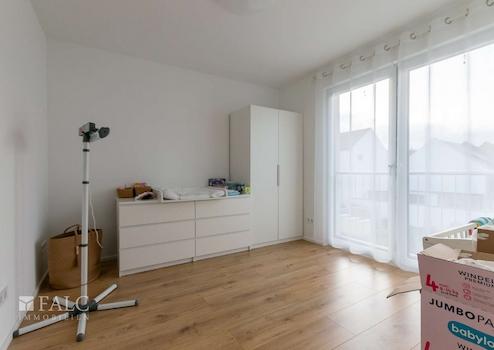Auch das 2. Obergeschoss verfügt über Laminatboden. Hier befinden sich ein großzügiges Schlafzimmer mit direktem Zugang zum großen Balkon sowie ein weiteres Tageslichtbad mit Walk-In-Dusche, Waschbecken mit Unterschrank, WC und Handtuchwärmer. Ein zusätzlicher Hochschrank bietet Platz für Handtücher und Badeutensilien.