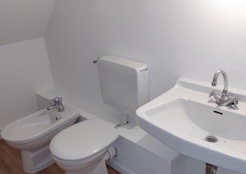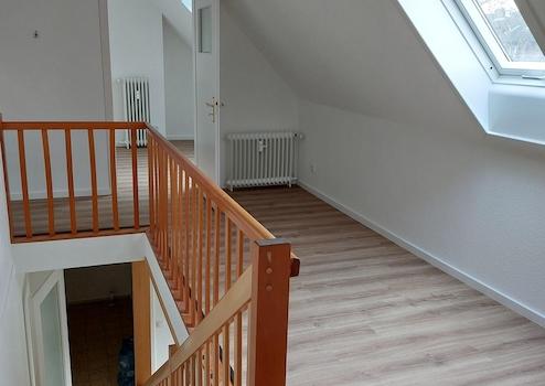 Die Wohnung selbst erstreckt sich vom Dachgeschoss in den Spitzboden. Der Fußbodenbelag besteht im Eingangsbereich, im Bad und im unteren Bad aus Fliesen, die übrigen Räume sind mit einem Vinyl-Belag ausgelegt.