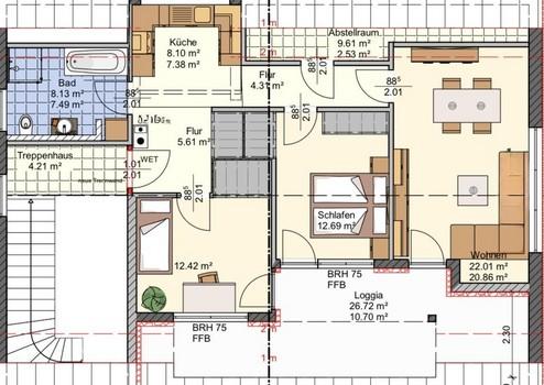 Zugang zur sonnigen, größtenteils überdachten Süd-Dachloggia (ca. 27 Quadratmeter, davon circa 11 m² anrechenbare Wohnfläche, über 3 Räume zugänglich) ist das Herzstück der Wohnung. Sie lädt zum Entspannen ein und erweitert den Wohnraum spürbar ins Freie.