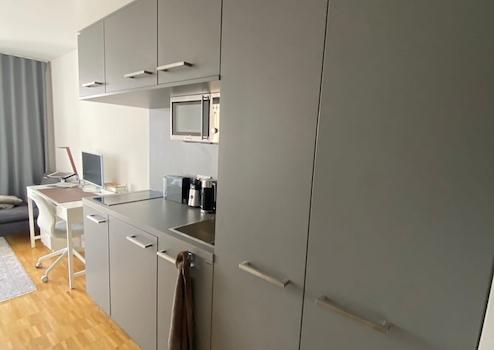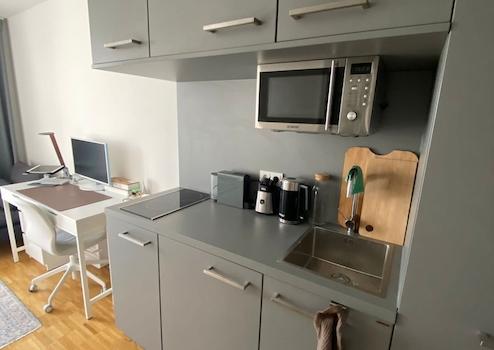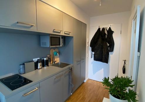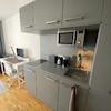 Das Apartment ist mit einer Pantry Küche inklusive Kühlschrank/Eisfach, Microwelle mit Grillfunktion und Glaskeramikkochfeld ausgestattet.