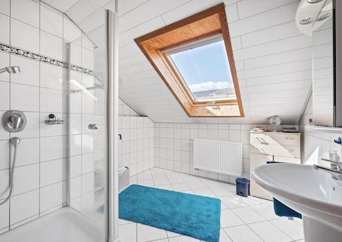Badezimmer: Helles, geräumiges Badezimmer mit Dusche und Fenster.