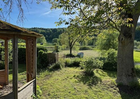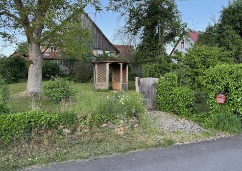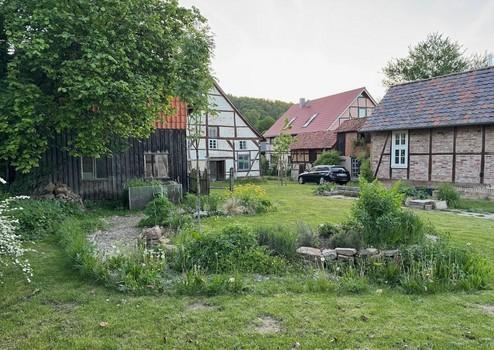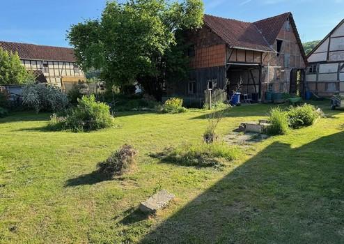 Der historische Vierseithof liegt am ruhigen Ortsrand, nur hundert Meter von der Weser entfernt, mit unverbaubarem Blick auf den Reinhardswald. Das weitläufige Anwesen umfasst ca. 1.700 m² Bauland plus zwei Wiesenparzellen (600 m² Obstwiese direkt gegenüber, 1.200 m² Wiese 500 m entfernt, derzeit verpachtet).