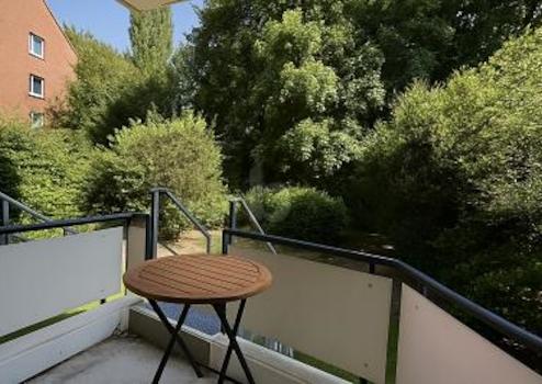 Der Wohn- und Schlafbereich ist mit modernem Laminatboden ausgestattet und bietet eine praktische Raumaufteilung mit Zugang zum sonnigen Südwest-Balkon.
