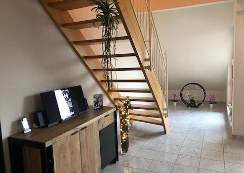 Schon beim Eintritt verspüren Sie die besondere Atmosphäre dieser Wohnung. Helle Räume, die klare durchdachte Raumaufteilung, und die geschickt eingefügte Holztreppe, die beide Etagen miteinander verbindet, verleihen diesem Zuhause seinen unverwechselbaren Charme. Im Mittelpunkt der Wohnung steht der großzügige Wohn- und Essbereich. Von hier aus gelangen Sie auf die große extravagante Loggia. Genießen Sie den freien Blick in die Weite, Ruhe und die Sonne bis tief in die Abendstunden. Die perfekte Wohlfühloase über den Dächern von Möglingen.