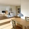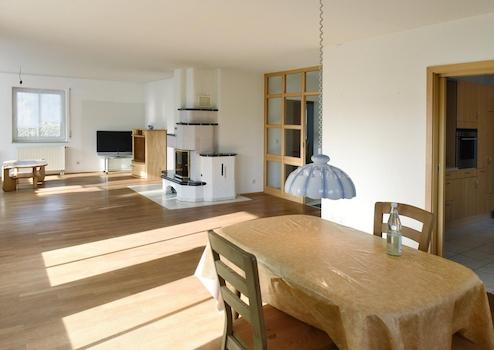 Bereits beim Hereinkommen wird vom Flur aus der offen gestaltete Wohn-Essbereich und dessen Parkett durch die Glaswand sichtbar. Der Wohn-Essbereich ist dank der vielen Fenster lichtdurchflutet und bietet einen tollen Blick ins Grüne. Die Wohlfühlatmosphäre rundet der Kamin ab, und lädt zu ruhigen Winterabenden ein.