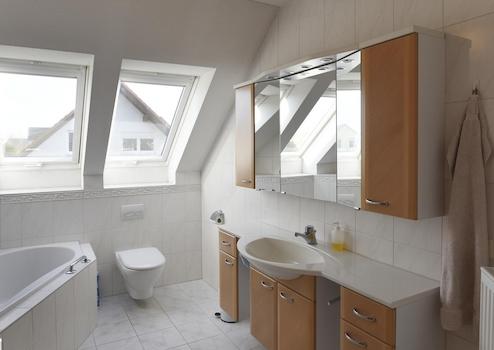 Möchte man im Alter barrierefrei das Erdgeschoss bewohnen, ist dies möglich. Im großzügigen Hauswirtschaftsraum sind bereits die Anschlüsse zum Ausbau eines Badezimmers vorhanden, und das vorgesehene Gästezimmer der Etage kann zu einem Schlafzimmer umfunktioniert werden.
