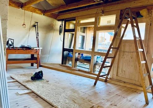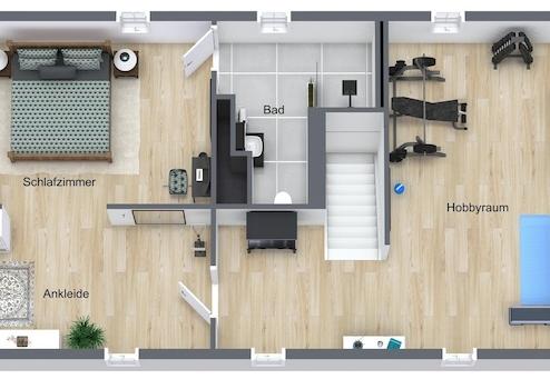 aktuell über das Haus zugänglich, kann perspektivisch aber auch über separaten Außenzugang nutzbar gemacht werden (als Einliegerwohnung geeignet); Schlafzimmer, Ankleidezimmer (auch als Arbeitsbereich nutzbar), eigener Wohnbereich mit Küchenvorbereitung, Bad im Rohbau, Veranda mit Starkstromanschluss (z. B. für Grill oder Außenküche)