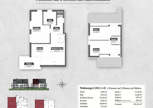 Diese 4 Zimmer Wohnung auf zwei Ebenen ist eine familienfreundliche Seltenheit, das in dieser Form am Markt kaum zu finden ist. Mit ca. 101,42 m² Wohnfläche, lichtdurchflutetem Wohnbereich und einem sonnigen Südwest Balkon vereint sie eine Architektur, die heute nur noch selten realisiert wird.
