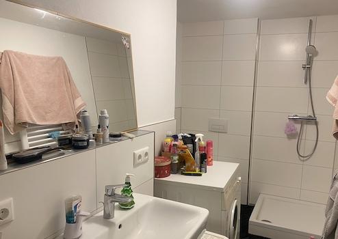 - innenliegendes Bad modern und hell gefliest mit Dusche, WC und Waschtisch