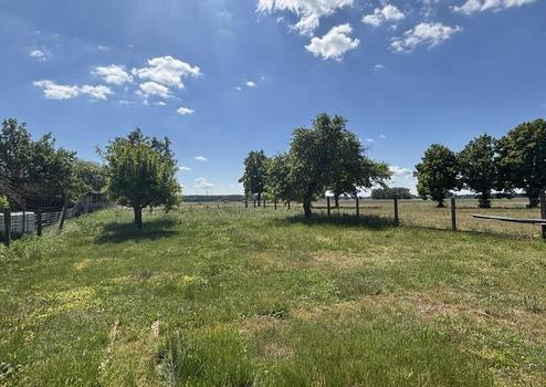 Der großzügige Gartenbereich bietet Platz zum Entspannen und freien Blick auf die umliegenden Felder.