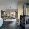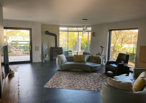 Weitläufiger Wohn-Ess-Bereich mit raumhohen Fenstern, Blick auf Garten und Pool, Stückholzofen und neuer Holzterrasse. Offene Küche (noch einzubauen oder OG mitnutzen), Gästezimmer, Musikzimmer, modernes Bad, direkter Zugang zur Garage und Terrasse.