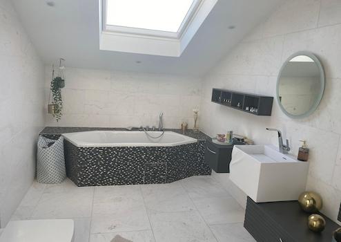 Auch separat zugänglich. Großzügige, moderne Küche, heller Wohn-/Schlafraum mit Einbauschrank und Loggia, weitere Zimmer mit Parkett und Dachfenster, stilvolles Bad mit Wanne in weißem Marmor, Schlafzimmer mit französischem Balkon. Ideal auch als eigene Wohneinheit.