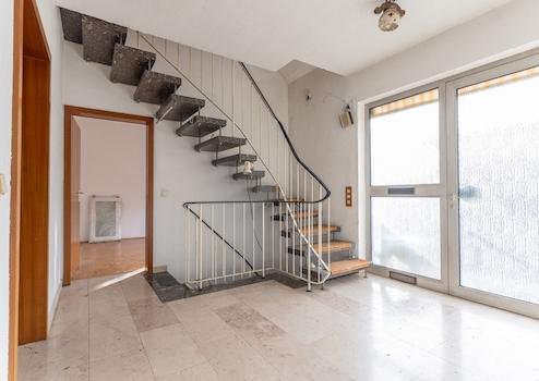 Geschosstreppen: Zum KG massiv mit Steinbelag, zum DG Stahlkonstruktion mit Steinstufen, Metallgeländer und PVC- Handlauf