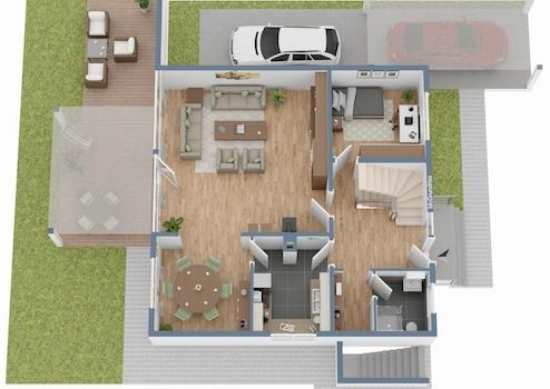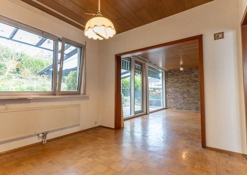 Wohn-/Esszimmer. Der rund 34 m² große Wohnbereich besticht durch große, bodentiefe Fensterelemente, die einen wunderbaren Blick in den angrenzenden Garten sowie auf die teilüberdachte Terrasse ermöglichen. Direkt neben dem Essbereich befindet sich die Küche, die kurze Wege im Alltag garantiert.