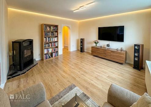 Beim Betreten der Wohnung empfängt Sie ein praktischer Flur mit Garderobenbereich und Einbauschrank. Von hier erreichen Sie das helle Wohnzimmer, das den Mittelpunkt der Wohnung bildet: große Fenster, ein Kaminofen und eine umlaufende, indirekte Lichtleiste (per Fernbedienung steuerbar) sorgen für eine gemütliche Atmosphäre – ideal für entspannte Feierabende oder einen ruhigen Homeoffice-Tag.